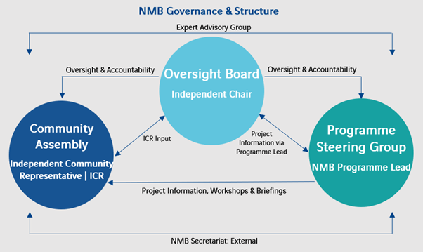- Scrutinise community feedback and concerns, suggestions regarding the NMB Programme, thoughts/questions around any other topic, suggested subjects for briefing sessions and/or Chair’s surgeries. Hold to account the Community Assembly on any actions adopted by the Oversight Board.